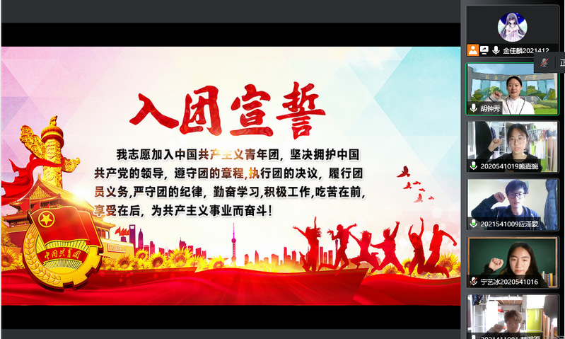 为庆祝中国共产主义青年团成立100周年,全面贯彻习近平新时代中国特色社会主义思想,深入学习贯彻习近平总书记在中国人民大学考察时的重要讲话精神,引导广大团员青年厚植爱国情怀,以实际行动迎接党的二十大召开,5月1日,在“五四”青年节到来之际,海角视频 团委组织开展“入团云宣誓”仪式。5名新发展的团员庄严宣誓,其他与会团员重温了入团誓言。