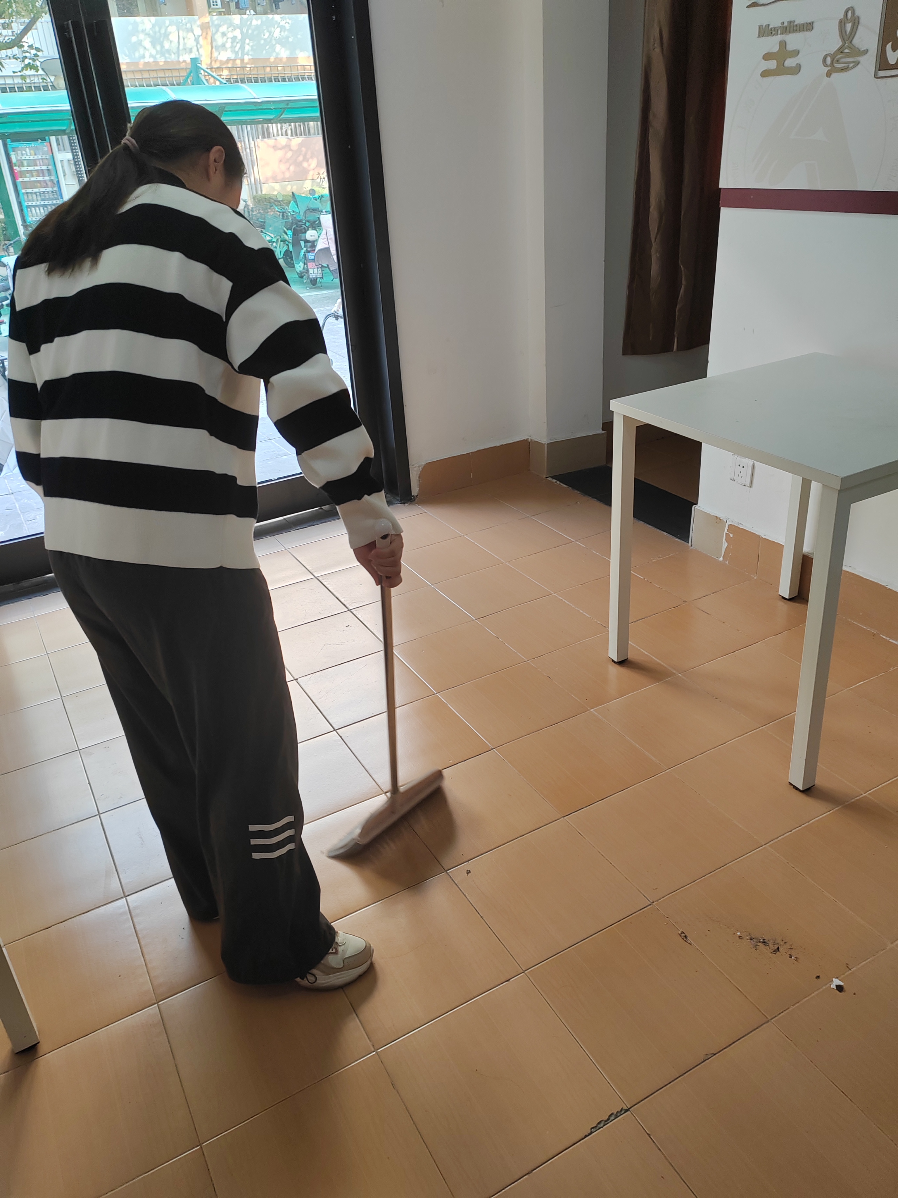 热爱生活,打扫卫生也是一种解压的方式。清理的是卫生、打扫的是心情。一尘不染的社区环境使人内心愉悦。学生定期打扫宿舍园区活动室,营造干净舒适的社区环境。
